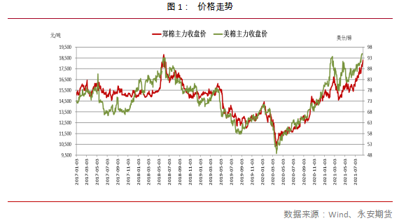 8月份,中美棉价在市场一片犹疑与期待中,双双站上新高。美棉主力12月合约最近于8月17日最高点至96.71美分/磅,这是7年来新高。同时和今年2月底高点95.6美分/磅及2018年6月初高点94.82美分/磅接近,基本是除2010/11暴涨行情外的高位区。郑棉近期高点则是8月18日所至的18505元/吨。较此前2月底高点17080元/吨高出8.34%,而较2018年高点19250/吨低3.87%。