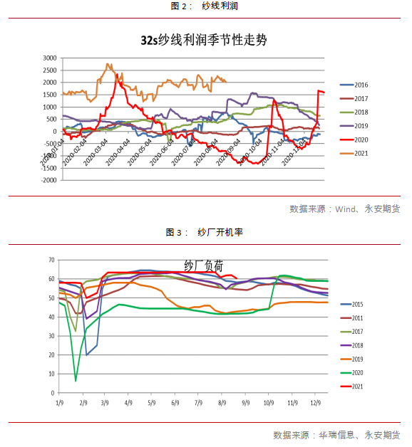 棉花的直接下游是纱厂,因此纱厂的高利润及高开机成为棉花产业利好的直接体现。去年10月份以来,纱厂维持高利润和高开机率已经较长时间,而今年以来的棉价上涨,产业因素上也大都有纱价上涨及纱厂利润高企的推动。而目前重新逼近万八的棉价,其对应的32支纱的利润依然有2000元/吨。